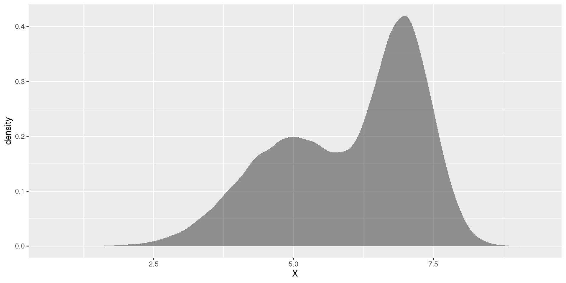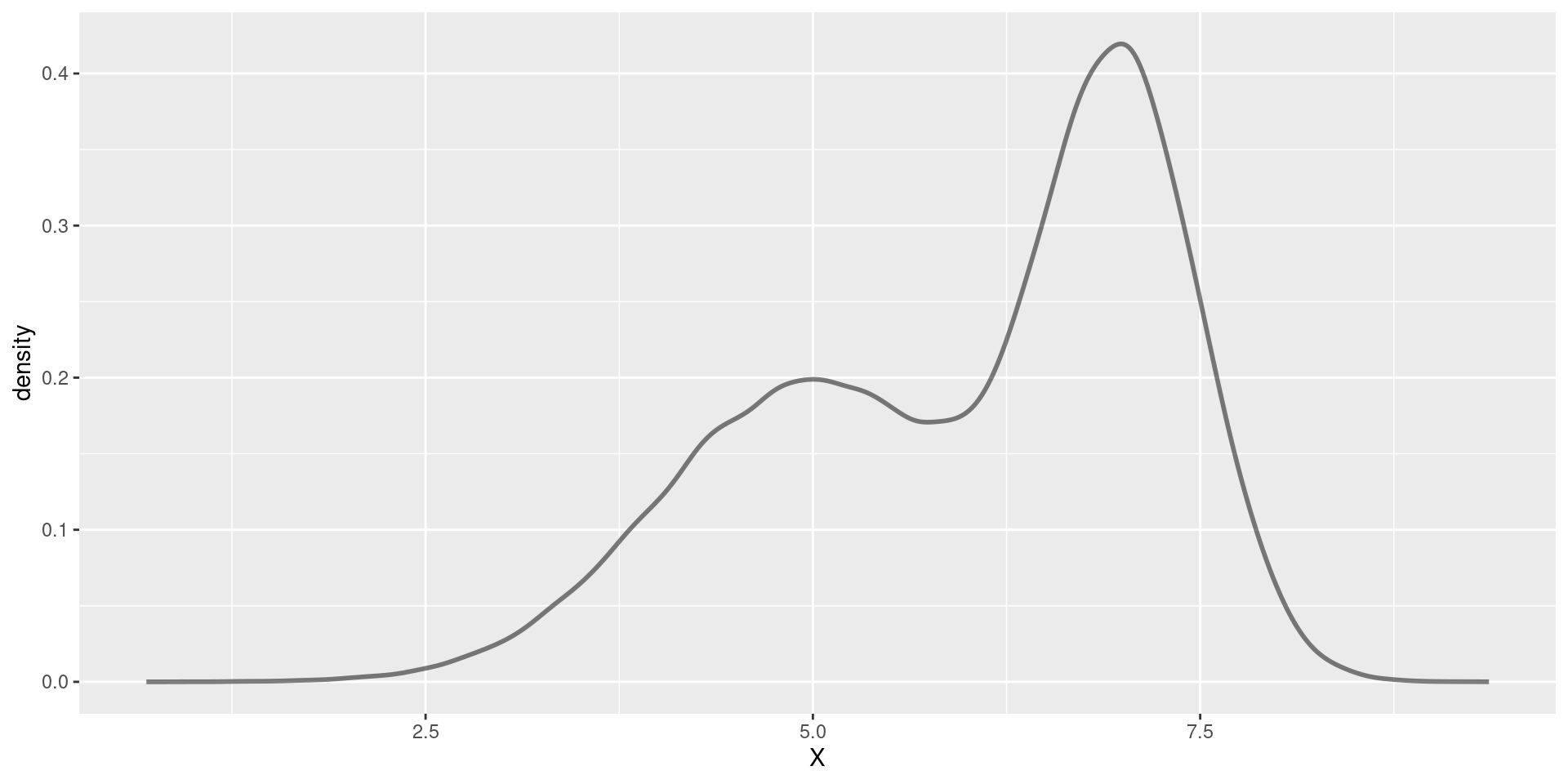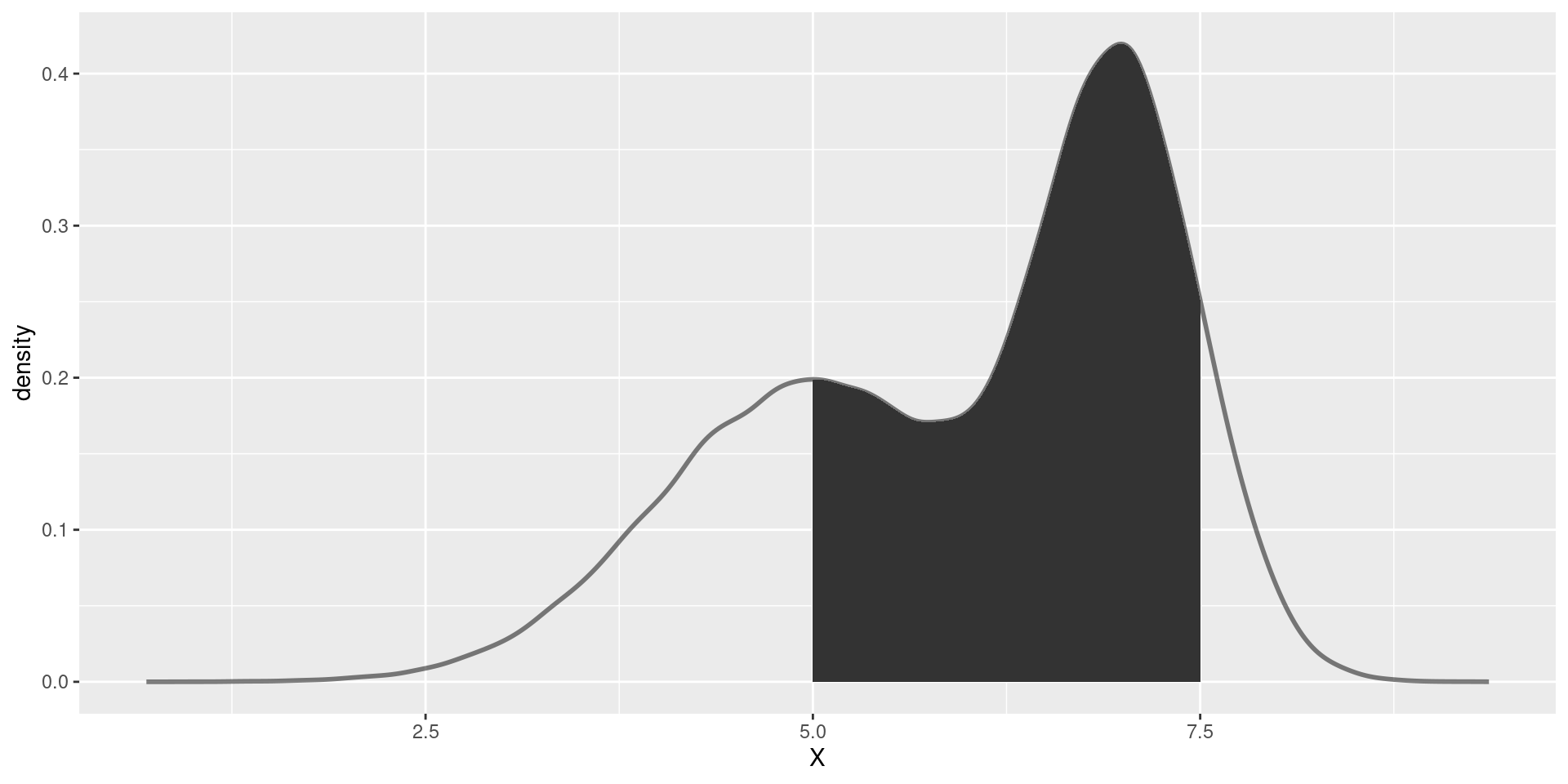 \(\operatorname{P}(a\le X \le b) = {}\) the area under the density curve, between \(a\) and \(b\).